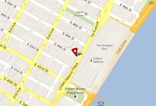 Located at the corner of 44th Street and 1st Avenue, directly across the street from the United Nations.