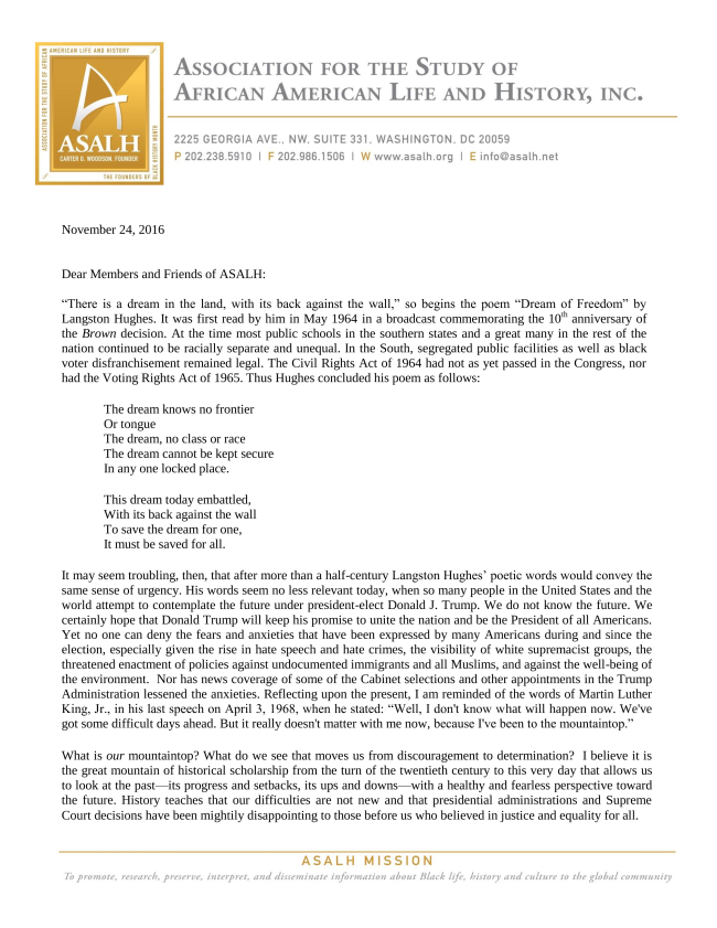 Subject: ASALH President's Statement on the 2016 Election
