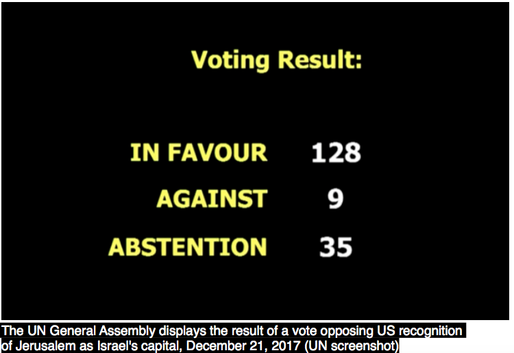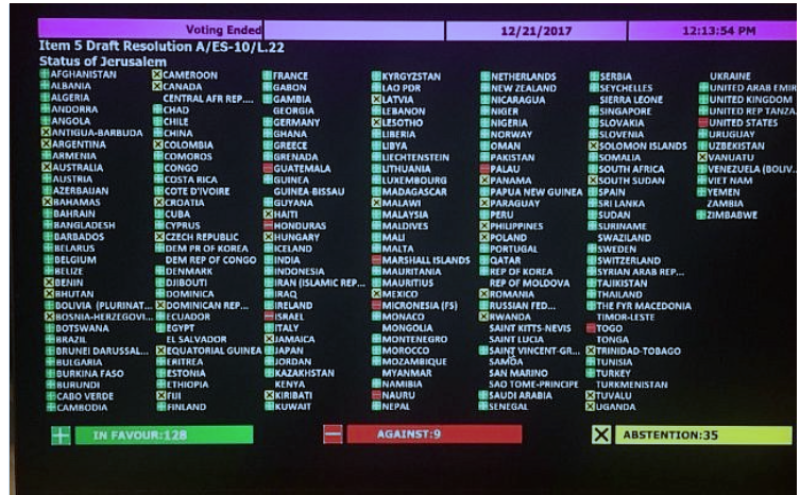 |  | Looking at it by MsJoe It was an extraordinary vote that will be etched in the psychic of nations as this ebbs the moral audacity of the United States. Never before has the fear of the super power been dulled by UN Members united in opposition to US position. A/RES/72/15 of 30 November 2017 on the Status of Jerusalem at the United Nations Headquarters in New York on December 21, 2017. The vehement reactions from the United States and Israel make the resolution all the more significant in message and intent even as the US wielded veto power in isolation of its position in the world. | | STATUS OF JERUSALEM: VOTING HAS BEEN COMPLETED, PLEASE LOCK THE MACHINE | How African countries performed or escaped from the whole shebang: Of the 54 AU Member States at the UN, only Togo voted against the resolution with United States, Israel, Guatemala, Honduras, Marshal Islands, Micronesia, Nauru Island, Palau. Abstention - Benin, Cameroon, Equatorial Guinea, Lesotho, Malawi, Rwanda, South Sudan, Uganda. No show - Central African Republic, Democratic Republic of Congo, Guinea Bissau, Kenya, Sierra Leone, Sao Tome and Principe, Swaziland, Zambia. South Africa joined to sponsor the resolution on the floor. | | | US WILL REMEMBER THIS DAY. REMEMBER WHEN SO MANY COUNTRIES COME CALLING....WE WILL REMEMBER THIS VOTE...HOW WE LOOK AT COUNTRIES WHO DISRESPECT US AT THE UN......WE EDUCATE AND FEED DESPERATE PEOPLE.....so says Ambassador Nikki Haley, US Ambassador to the UN |