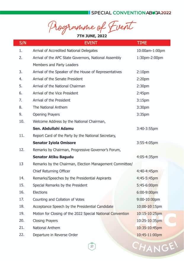 The All Progressives Congress APC is set to conduct it's presidential primary election on the 7th of June as scheduled with the release of it's program of events for the day.